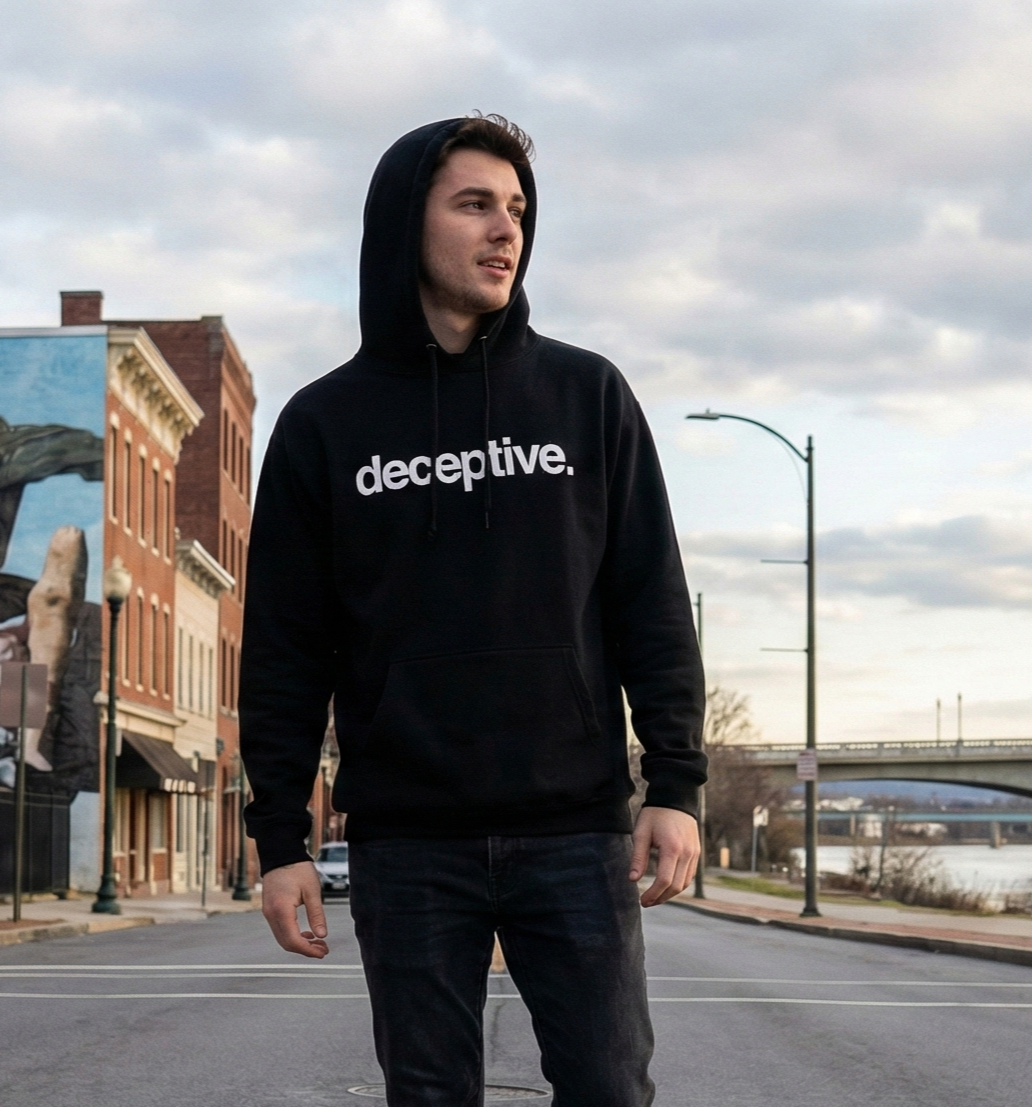 The Deceptive Logo Hoodie features our signature deceptive. design printed across the front on a classic black hoodie. It’s an easy, versatile piece that pairs well with jeans, joggers, or layered under a jacket.